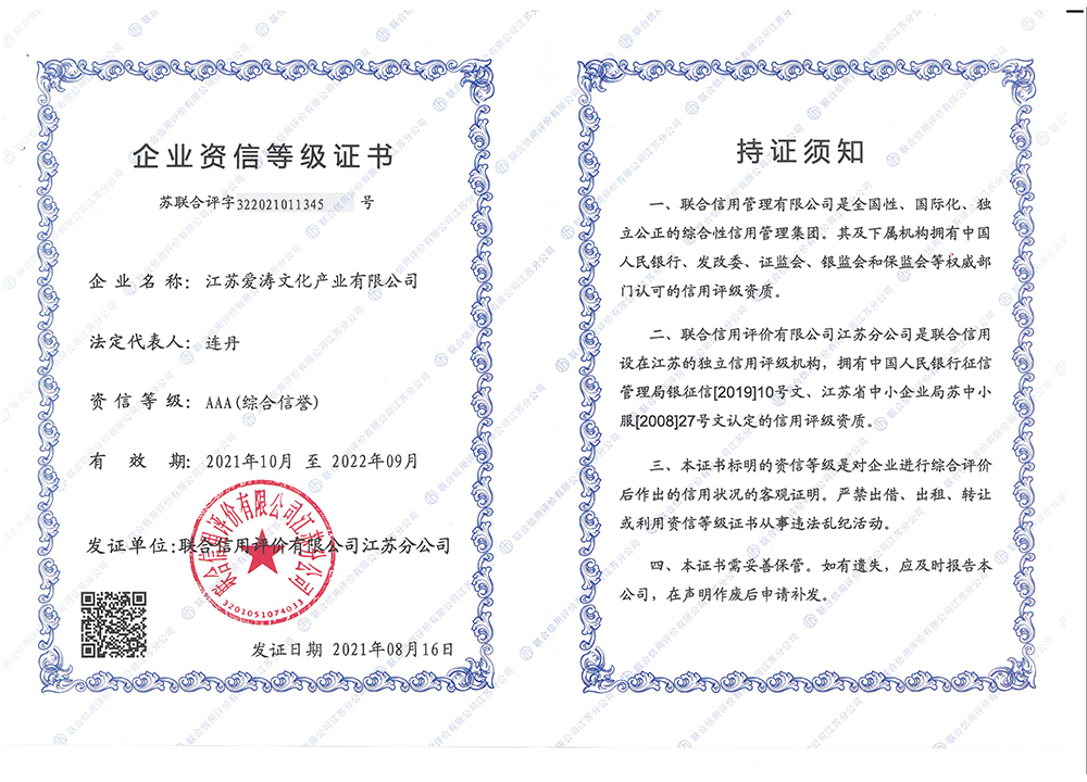 聯合信用AAA資信等級證書