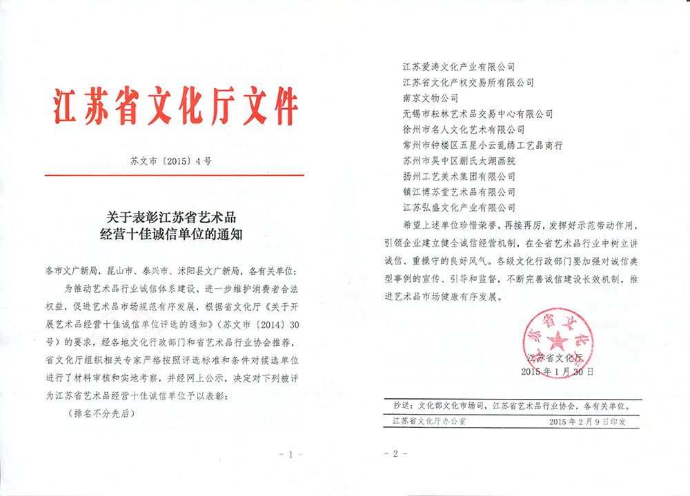 2014年江蘇省藝術品經營十佳誠信單位